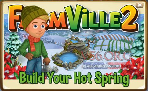 Next best thing to springtime is here in Farmville 2 Build Your Hot Spring. Help your farm animals to become warm. You and your friends built a Hot Spring. Collect building materials by asking your friends for parts and materials. Helping a friends will also give you additional parts. Win a Baby Ongole Cow when you complete the task.